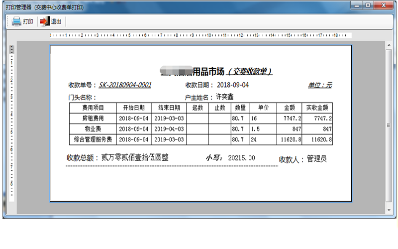 输入房号后自动带出该商户所有的欠费信息,输入交款金额自动计算找零金额并打印收款票据!