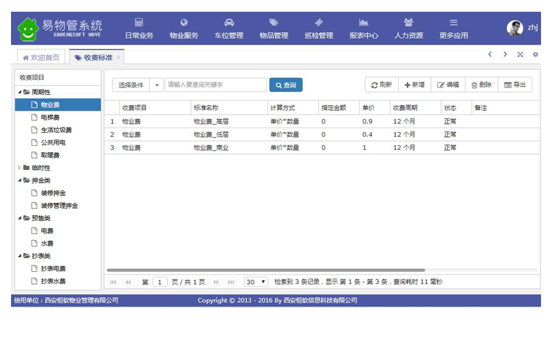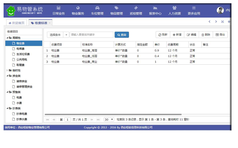 周期性费用系统自动生成,同时支持押金的收取与退回、门禁卡、补卡等临时费用的收取以及暖气费用管理!